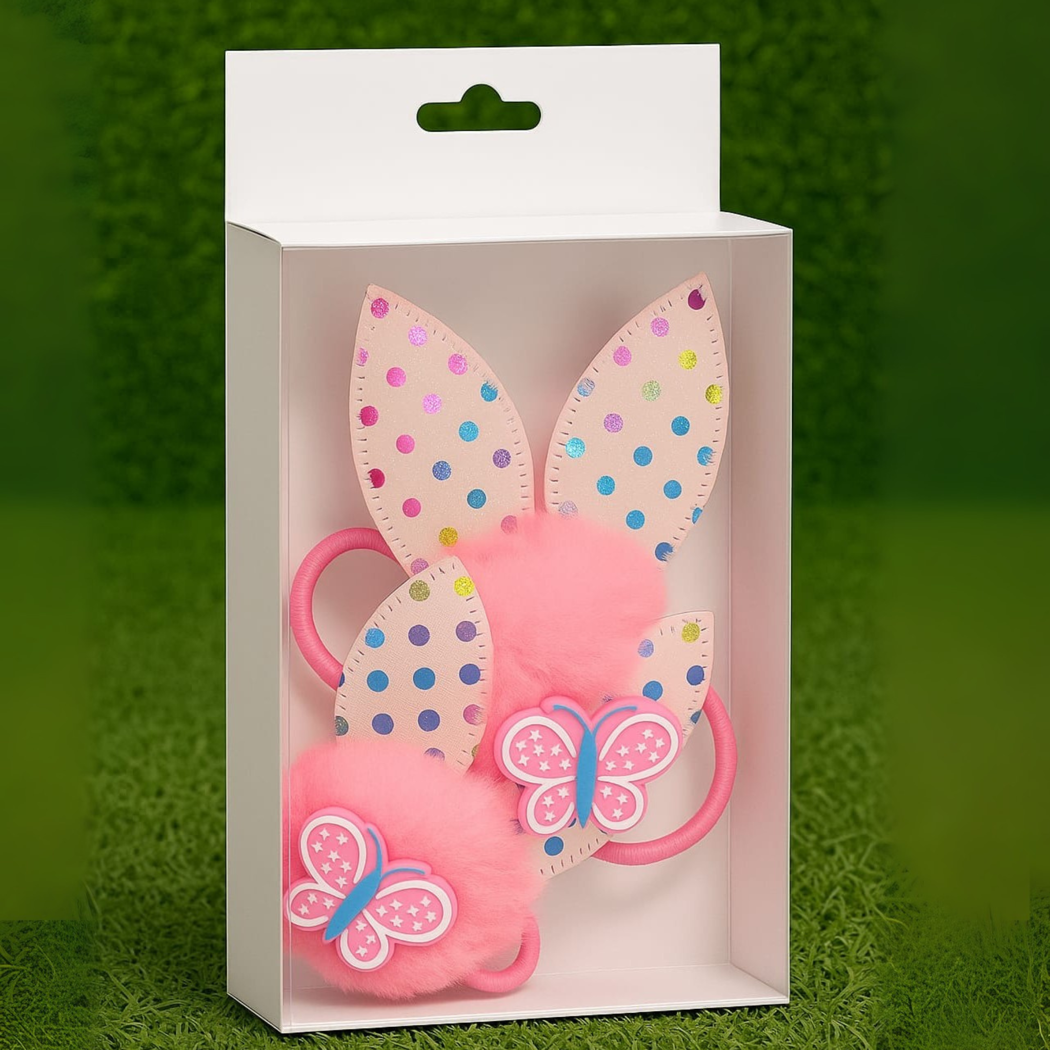 This is a cute and colorful pair of children's hair accessories packaged in a clear resealable plastic bag. Each hair tie features a soft, fluffy pink pom-pom base adorned with a decorative pink butterfly embellishment. Behind the pom-poms, two bunny ear-shaped attachments with shiny, multicolored polka dots add a playful and festive touch. The elastic hair bands are pink, complementing the overall vibrant and fun aesthetic—perfect for kids’ casual or party wear.