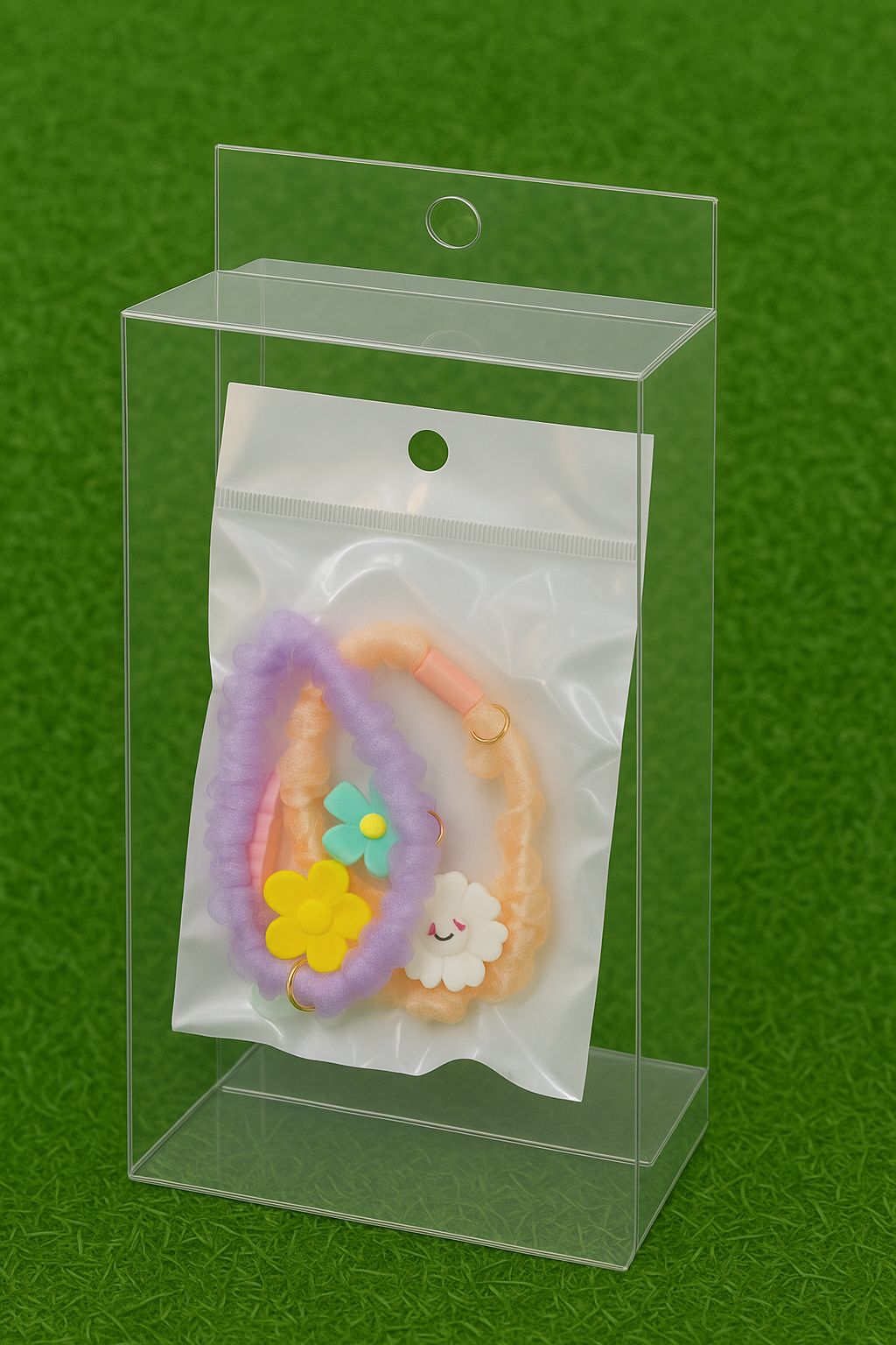 Set of colorful elastic hair ties packaged in a transparent resealable plastic pouch. The hair ties come in soft pastel shades of peach and lavender, each adorned with cheerful flower-shaped charms in yellow, mint green, and white. The white flower features a cute smiling face, adding a playful and friendly touch. The entire pouch is displayed inside a sleek, clear rectangular display box, which sits on a vibrant green artificial grass surface. The contrast between the vivid background and the delicate, playful accessories enhances their visual appeal, making them look gift-ready or retail-presentable.